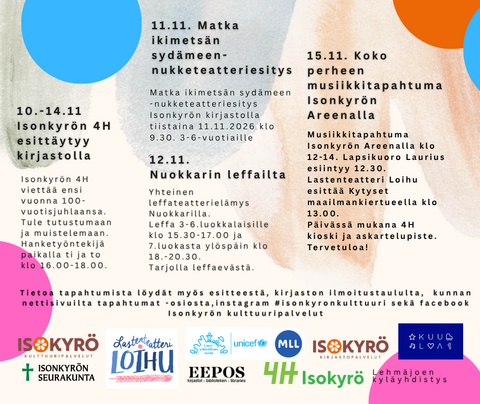 Tapahtumista tietoa kirjaston ilmoitustaululta, Etelä-Pohjanmaan tapahtumakalenterissa sekä sosiaalisessa mediassa. Muutokset ovat mahdollisia. Ota seurantaan Isonkyrön kulttuuripalveluiden Instagram sekä Facebook!