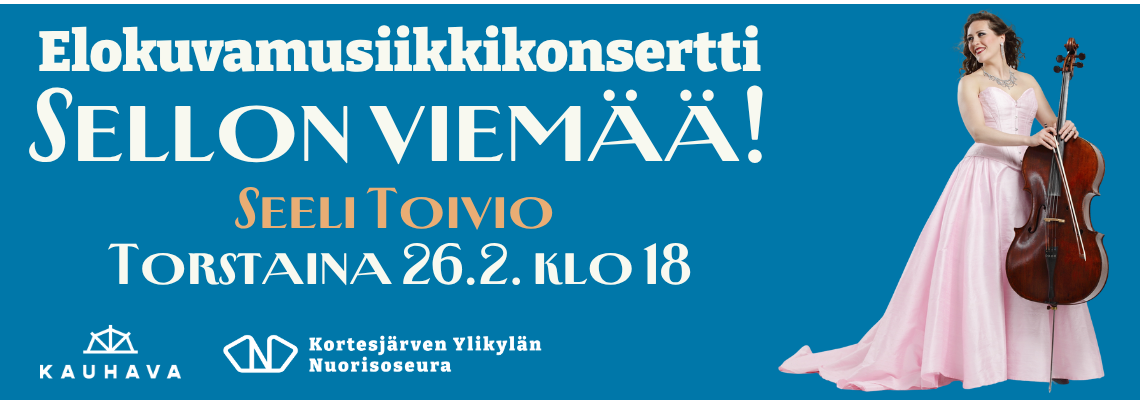 Tervetuloa elokuvamusiikin tunnelmiin! Sellisti ja laulaja Seeli Toivio esiintyy Kortesjärven Ylikylän Nuorisoseuralla torstaina 26.2. klo 18. Reilun tunnin mittaisessa konsertissa kuullaan elokuvamusiikkia ja Suomifilmien tunnelmia, mm. Myrskyluodon Maijan säveliä. Titanic, Arrival, Game of Thrones, Tuulen viemää, Interstellar, Forrest Gump, Vertigo, Gladiaattori sekä Ennio Morriconen musiikkia ja monia muita tuttuja sävelmiä elävienkuvien maailmasta.