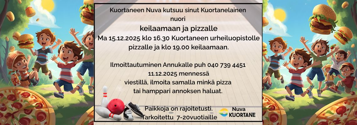 Kuortaneen Nuva kutrsuu sinut Kuortanelainen nuori pizzalle ja keilaamaan Kuortaneen urheiluopstolle.