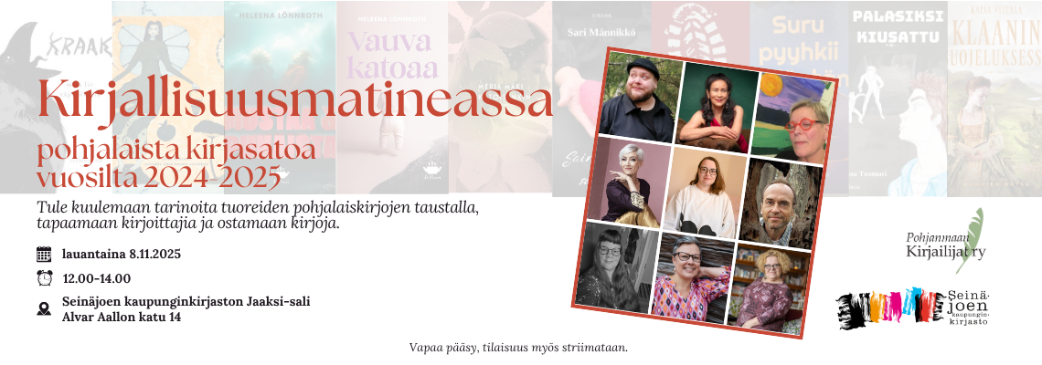 Tule kuulemaan, millaisia tarinoita tuoreiden pohjalaiskirjojen taakse kätkeytyy ja tapaamaan niiden kirjoittajia. Tilaisuudessa voi myös ostaa kirjoja ja saada niihin kirjoittajan signeeraus.