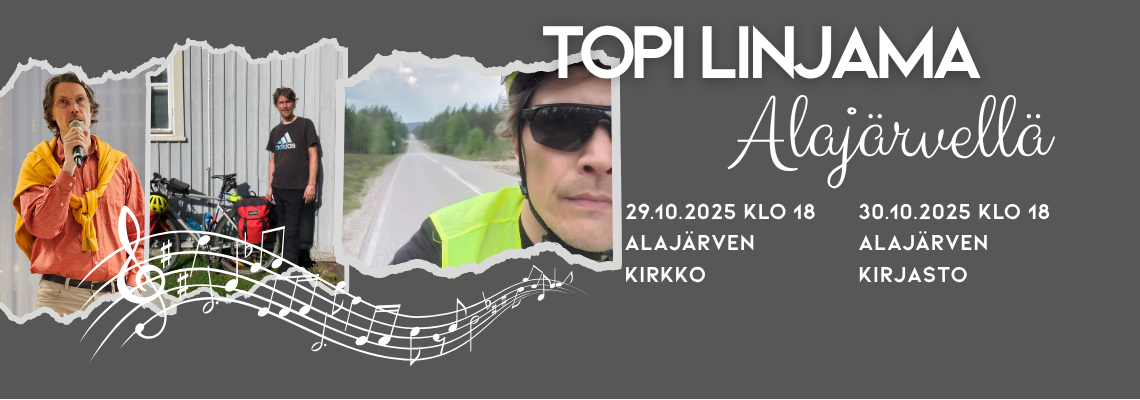 Topi LInjama esiintyy myös Alajärven kirkossa ke 29.10. klo 18. Siellä aiheena ovat erilaiset muunnelmatyypit, erityisesti Bachin Goldberg-variaatiot. Illassa kuullaan myös tarinoita Topin pyörämatkalta. Musiikkiopistolaiset esiintyvät.