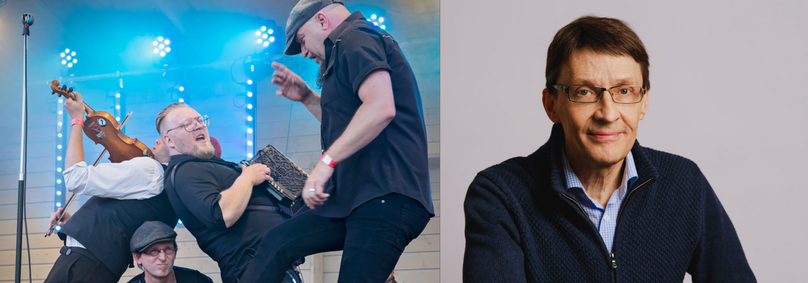 Pääkirjaston pikkujoulussa livebändi Pirulainen ja kirjailija Markus Nummi