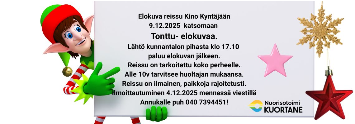 Reissu kino Kyntäjään alavudelle katsomaan tonttu-elokuvaa. Tonttu on lämmin tarina ystävyydestä, rohkeudesta ja mielikuvituksen voimasta. Lumi ja Talvi ovat olleet erottamattomat koko elämänsä ajan, kunnes kohtalo yllättäen ajaa heidät erilleen. Lumi päätyy taianomaiseen tonttumaahan, jossa tontut valmistavat joululahjat kaikille maailman lapsille.
