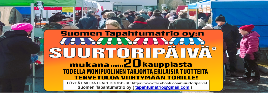 Suomen Tapahtumatrio oy:n Suurtoripäivä on isompi toripäivä kuin useimmilla paikkakunnilla toripäivät normaalisti, mutta pienemmät kuin markkinat. Siksipä me ollaankin koottu tämä meidän oma kauppiasporukka erilaisten tuotteiden myyjistä, että saadaan tarjottua teille mahdollisimman laaja ja monipuolinen kattaus.